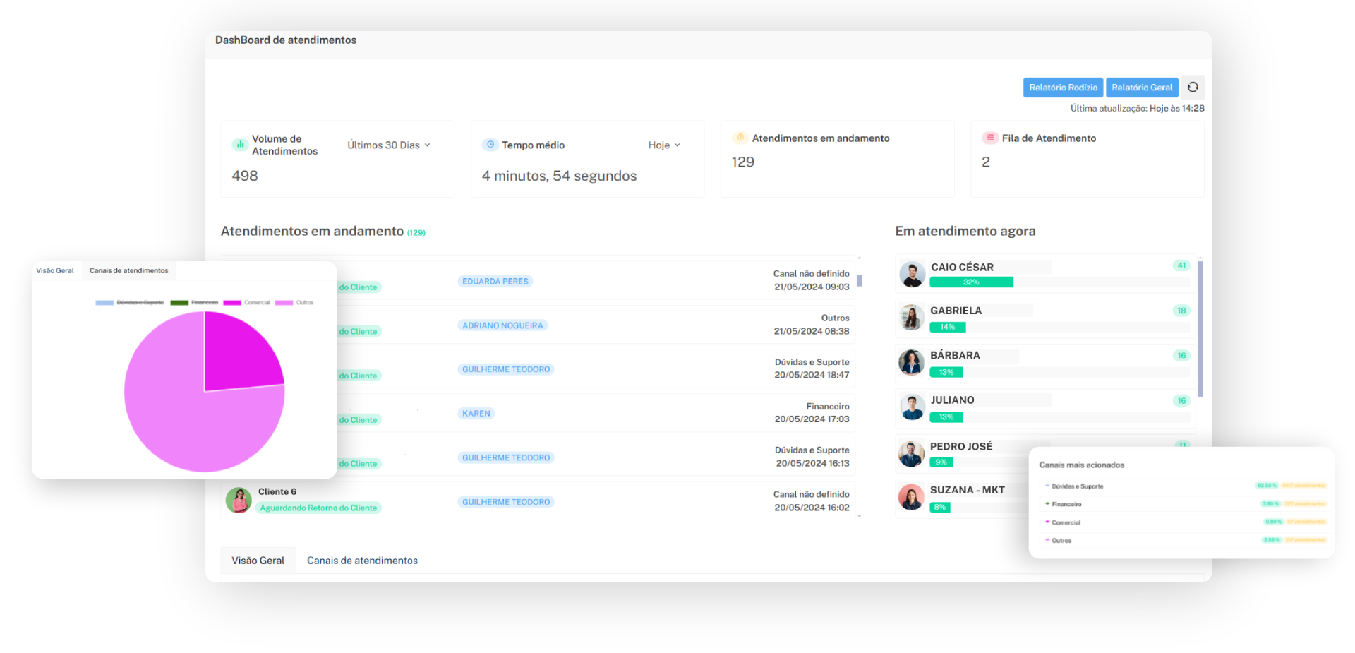 Você pode acessar a muitas informações, como: volume de atendimentos, tempo de espera dos clientes para serem atendidos, ranking de faturamento, relatório de conversões, e muito mais!
