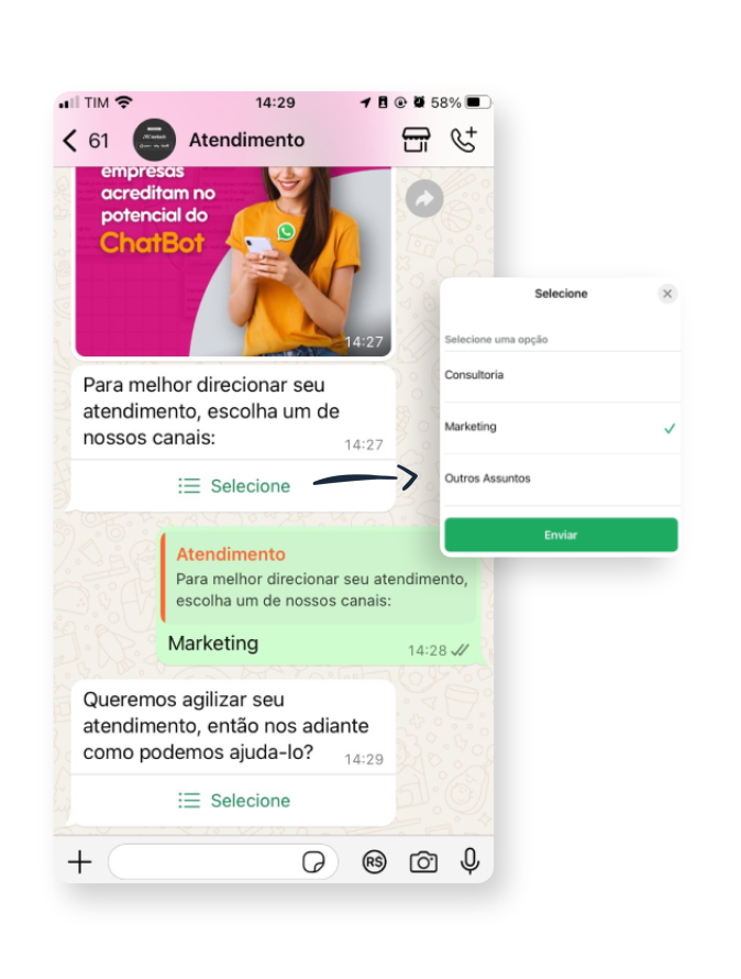 Com o chatbot do Whiz, você diminui a necessidade de atendimento manual para questões simples, economizando recursos e otimizando a operação sem comprometer a qualidade.